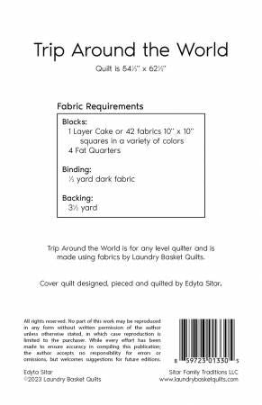 From Laundry Basket Quilts By Sitar, Edyta In Quilts Laundry Basket Quilts Traditional Quilt Pattern - Trip Around the World This pattern is perfect for any level quilter and looks great in any color combination! Cover picture shown in the Noel fabric collection. Printed Paper Pattern Finished Size: 54-1/2in x 62-1/2in Final Product: Quilt Technique Used: Standard Machine Sewing Skill Level: Any Level