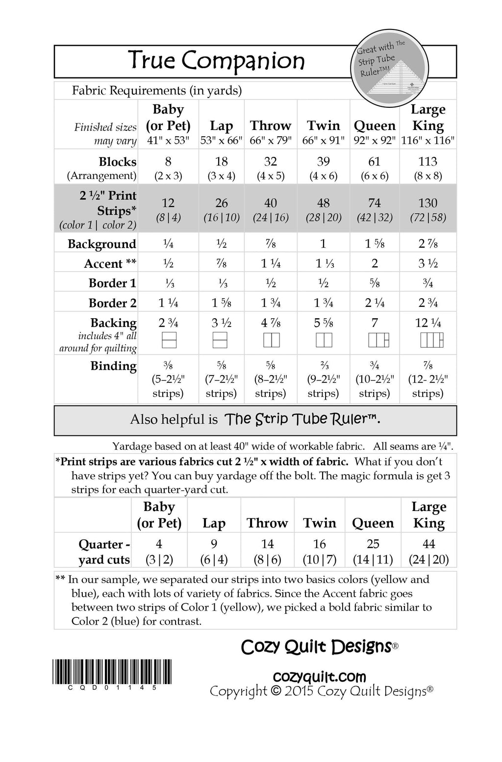 From Cozy Quilt Designs In Quilts "A Cozy Strip Club Pattern Designed for 2½"" Strips Great with The Strip Tube Ruler™! A portion of the proceeds from the sale of our True Companion pattern will be donated to Canine Companions for Independence®. The design of True Companion produces a wonderful optical effect that's easy to accomplish with the help of our Strip Tube Ruler™. Just separate your strips by two colors to alternate with an accent color as you sew your blocks and setting triangles. Or keep it scrappy for a completely different look! We created our sample quilt in CCI's logo colors to honor this great organization. Try making a Pet sized version of this quilt for your own True Companion! We bet they would love one in soft flannel fabric. The pattern includes instructions for: • Baby (or Pet) • Lap • Throw • Twin • Queen • King