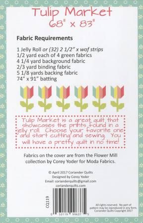 From Coriander Quilts By Yoder, Corey In Quilts Tulip Market is a great quilt that showcases the prints found in a jelly roll. Choose your favorite one and start cutting and sewing. You will have a pretty quilt in no time! Quilt size = 68in x 83in.