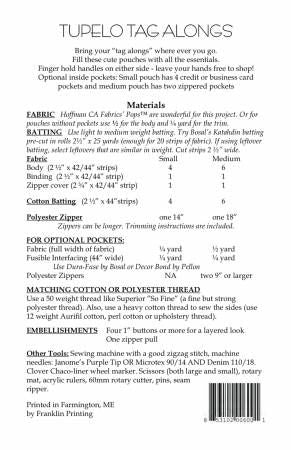 From Aunties Two In Bags, Purses, Totes & Electronic Covers Cute zippered tag along pouches in two sizes: Small 5” wide x 3” deep x 4 ½” tall, Medium 8” wide x 3” deep x 5 ½” tall. Optional inside pockets. Uses Bosal’s new pre-cut rolls of Katahdin Cotton Batting
