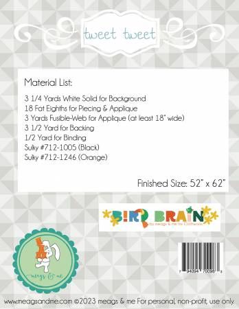 From Meags and Me In Quilts Deconstructed pinwheels & easy applique birds. One Fat Eighth bundle needed. Finished size: 52" x 62" Printed Paper Pattern Finished Size: 52in x 62in Final Product: Quilt Paper Templates Included Technique Used: Applique / Hand Embroidery / Stitchery Skill Level: Confident Beginner