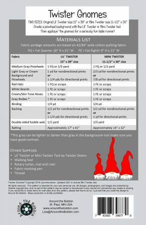From Around the Bobbin By Amundson, Lisa In Placemats, Table Runners & Toppers Now includes 2 sizes! A fun, easy holiday table runner pattern combining use of appliqued gnomes and pinwheels made from the Lil' Twister tool or Mini Twister tool. Bonus templates for smaller gnomes included for use on coordinating items such as potholders, kitchen towels or other projects. - Original Lil’ Twister size: 15in (W) x 39in (H) - Mini Twister size: 11in (W) x 29in (H) Printed Paper Pattern Final Product: Table Runner Finished Size: 15in (W) x 39in (H) and 11in (W) x 29in (H) Technique: Standard Machine Sewing