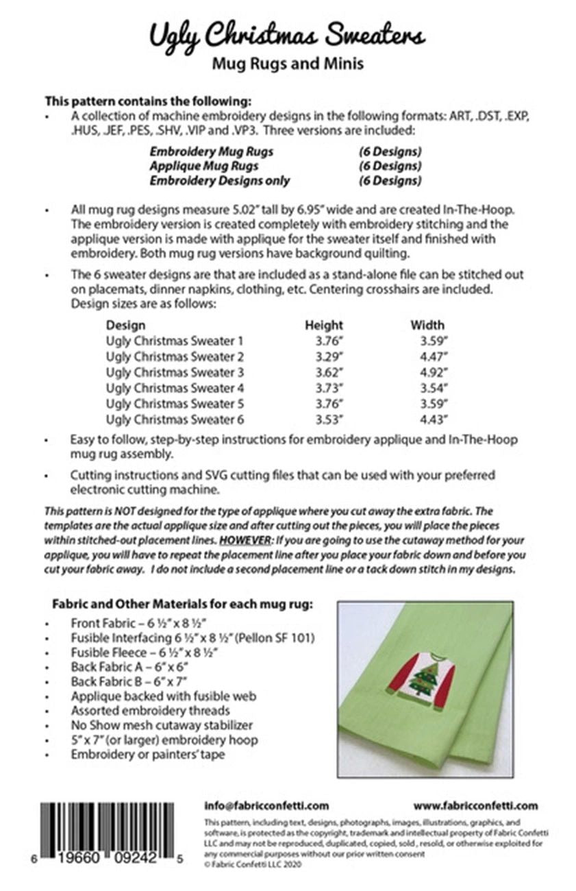 From Fabric Confetti By Fromm, Vanessa In Coasters and Mug Rugs This pattern contains three variations of the smaller Ugly Christmas Sweaters: Applique Mug Rugs, Embroidery Mug Rugs, and stand alone Embroidery Designs. All the six mug rug designs measure 5.02” height by 6.95 “ in width and are created to be embroidered In-The-Hoop. The embroidery version is created completely with embroidery stitching and the applique version is made with applique for the sweater itself and finished with embroidery. Both mug rug versions have background quilting. The six sweater designs are also included in an embroidery only version and can be stitched out on napkins, place-mats, aprons etc. Centering cross-hairs are included. Embroidery only designs are approx 4" x 5". Designs come in the following formats: .ART, .DST, .EXP, .HUS, .JEF, .PES, .SHV, .VIP and.VP3. A hoop with an embroidery field at least 160mm x 200mm (6” x 7.8”) or similar is REQUIRED. PDFs and SVGs for applique are included.