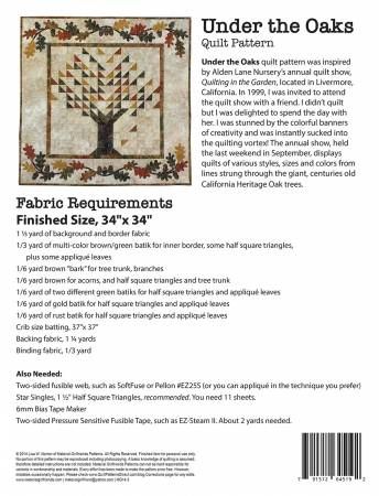From Material Girlfriends In Quilts Under the Oaks quilt pattern by Material Girlfriends Finished Size, 34"x 34" This delightful quilt uses appliqué and piece work. Material Girlfriend Patterns are easy to read and follow with detailed cutting and sewing instructions. Enjoy step-by-step instructions with plenty of graphics for the visual learner. Visit their youtube channel for many free sewing videos. Two 13" x 19" sheets included for appliqué template. 1 1/3 yard of background and border fabric 1/3 yard of multi-color brown/green batik for inner border, some half square triangles, plus some appliqué leaves 1/6 yard brown “bark” for tree trunk, branches 1/6 yard brown for acorns, and half square triangles and tree trunk 1/6 yard of two different green batiks for half square triangles and appliqué leaves 1/6 yard of gold batik for half square triangles and appliqué leaves 1/6 yard of rust batik for half square triangles and appliqué leaves Crib size batting, 37"x 37" Backing fabric, 1 1/4 yards Binding fabric, 1/3 yard Also Needed: Two-sided fusible web, such as SoftFuse or Pellon #EZ25S (or you can appliqué in the technique you prefer) Star Singles, 1 1/2" Half Square Triangles, recommended. You need 11 sheets. 6mm Bias Tape Maker Two-sided Pressure Sensitive Fusible Tape, such as EZ-Steam II. About 2 yards needed. Printed Paper Pattern Finished Size: 34in x 34in Final Product: Quilt Paper Templates Included Technique Used: Applique / Standard Machine Sewing Skill Level: Intermediate