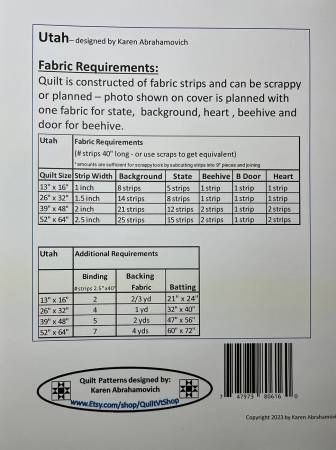 From Karen Abrahamovich By Abrahamovich, Karen In Quilts Utah - A quilt Pattern in 4 Sizes! Utah - The Beehive State! Also known for skiing and Salt Lake City. The finished quilt size is determined by the width of the strips used for construction. Strip widths range from 1" to 2.5" and a detailed construction "map" guides provides details needed to produce a great quilt! Quilt size options are 13" x 16", 26" x 32", 39" x 48", 52" x 64". Sizes vary for multiple wall hanging options (the smallest also is a great size for a pillow) or go big for a great throw quilt.