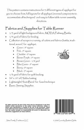 From Laundry Basket Quilts By Sitar, Edyta In Placemats, Table Runners & Toppers This pattern contains instructions for 3 different types of applique for you to choose from, full layouts for all applique and easy to follow table runner assembly directions.