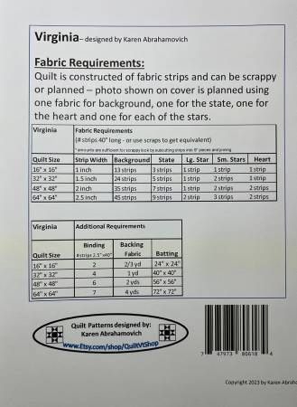 From Karen Abrahamovich By Abrahamovich, Karen In Quilts Virginia- A quilt Pattern in 4 Sizes! Virginia known as the Birthplace of America and was the site of the first permanent colony at Jamestown. The finished quilt size is determined by the width of the strips used for construction. Strip widths range from 1" to 2.5" and a detailed construction "map" guides provides details needed to produce a great quilt! Quilt size options are 16" x 16", 32" x 32", 48" x 48", 64" x 64". Sizes vary for multiple wall hanging options (the smallest also is a great size for a pillow) or go big for a great throw quilt.