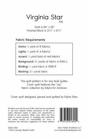 From Laundry Basket Quilts By Sitar, Edyta In Quilts Pieced Quilt Pattern using the "Joy" fabric collection, designed by Edyta Sitar for Andover. Perfect for any level quilter! Quilt size is 56" x 56" Printed Paper Pattern Finished Size: 56in x 56in Final Product: Quilt Technique Used: Standard Machine Sewing Skill Level: Any Level