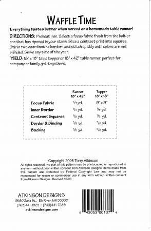 From Atkinson Designs By Atkinson, Terry In Placemats, Table Runners & Toppers Everything tastes better when served on a homemade table runner! A fun and easy table runner in two sizes. 18" x 18" and 18" x 42"