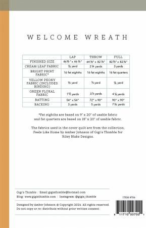 From Gigi's Thimble By Johnson, Amber In Quilts Welcome Wreath comes with instructions for 3 size options - Lap = 46-1/2" x 46-1/2", Throw = 64-1/2" x 82-1/2", and Full = 82-1/2" x 82-1/2". Traditionally pieced and beginner friendly. Perfect for fat eighths or fat quarters. Printed Paper Pattern Finished Size: Multiple Final Product: Quilt Technique Used: Standard Machine Sewing Skill Level: Beginner