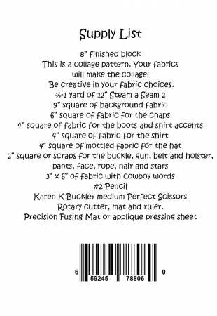From Fiberworks Inc By Heine, Laura In Placemats, Table Runners & Toppers Whatevers! #47 Cowgirl Collage Pattern by Laura Heine. Whatevers are 8” collage blocks that you can turn into runners, potholders, tiny quilts or continue making the designs for a large collage quilt! Includes pattern with complete color photo and instructions to complete the block. You can do whatever you want with the finished block! New pattern designs will be released whenever! Printed Paper Pattern Finished Size: 8in x 8in Final Product: Placemat / Table Topper / Table Runner Paper Templates Included Technique Used: Standard Machine Sewing Skill Level: Beginner