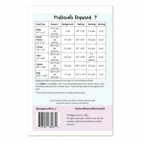 From Megan Collins Quilt Design By Collins, Megan In Quilts Where Flowers Bloom is a spring inspired modern quilt. Where Flowers Bloom is an intermediate curved piecing pattern. The fabric requirements include both fat quarter and half yard friendly measurements. Or use your stash! The Make a Scrappy Quilt section breaks down the pieces of the quilt to make going through your scraps easier. There are so many ways to make this quilt reflect your unique style and fabric stash. Pattern Sizes: Baby (41" × 41"), Small Throw (57" × 57"), Throw (74" × 74"), Twin (74" × 89"), Queen (89" × 105"), King (105" × 105") Pattern level: Intermediate Sewing Techniques: Curved piecing Printed Paper Pattern Finished Size: Multiple Final Product: Quilt Technique Used: Standard Machine Sewing / Curved Piecing Skill Level: Intermediate