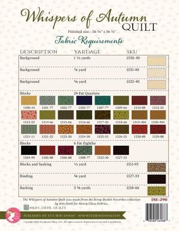 From It's Sew Emma In Quilts In her new quilt pattern, Kim Diehl takes the nine-patch concept to create two blocks with a rich play of fall colors. Simple Sawtooth Stars frame scrappy nine-patch centers using multiple prints and backgrounds. However, it is the Goose on the Loose block that takes the unequal nine patch concept to new heights. Using hourglass units and corners on squares, Kim creates a churn dash in the block center. Pieced in her Scrap Basket Favorites collection, the Whispers of Autumn quilt shines with fall’s warm rich colors. Finished sizes: 56.5" x 56.5"