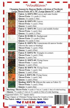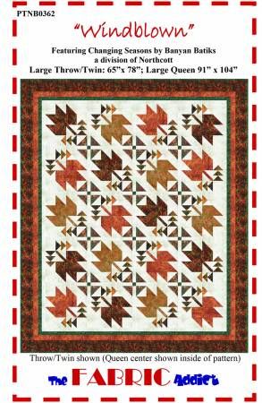 From Fabric Addict By Schindler, Karen In Quilts Windblown quilt pattern. Two sizes: Large Throw/Twin, Large Queen. Shown in batiks, also good for any fall collection or done scrappy. Printed Paper Pattern Finished Size: 65in x 78in & 91in x 104in Final Product: Quilt Technique Used: Standard Machine Sewing Skill Level: Confident Beginner