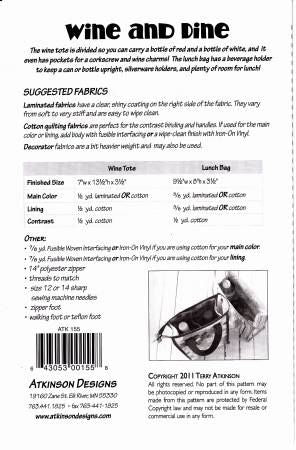 From Atkinson Designs By Atkinson, Terry In Bags, Purses, Totes & Electronic Covers The wine tote is divided so you can carry a bottle of red and a bottle of white. The lunch bag has a beverage holder, silverware holders, and plenty of room for lunch! wine 7"w x 13"h x 3-1/2" lunch 9"w x 8"h x 3-1/2