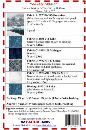 From Fabric Addict By Schindler, Karen In Quilts Winter Magic quilt pattern. Throw size: 58” x 67”. Snowflakes are appliqued using lightweight paperback fusible product. Featured fabric is Off the Grid by Hoffman. Printed Paper Pattern Finished Size: 58in x 67in Final Product: Quilt Paper Templates Included Technique Used: Standard Machine Sewing / Applique Skill Level: Confident Beginner
