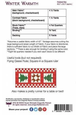 From Dragonfly Fiberart By Michaels, Susan In Quilts Easy to make row quilt using themed 12" blocks and checkerboard accent rows in a fun throw quilt 66" x 82". Perfect for the confident beginner through the most experienced sewer. Easy to kit with fat quarters and yardage. Pattern includes a bonus table runner pattern using the same block motifs. Shown on the cover in holiday fabrics but also works well in more neutral colors such a a blue theme or country tones to make it a great cabin throw. Printed Paper Pattern Finished Size: 66in x 82in Final Product: Quilt Technique Used: Standard Machine Sewing Skill Level: Confident Beginner