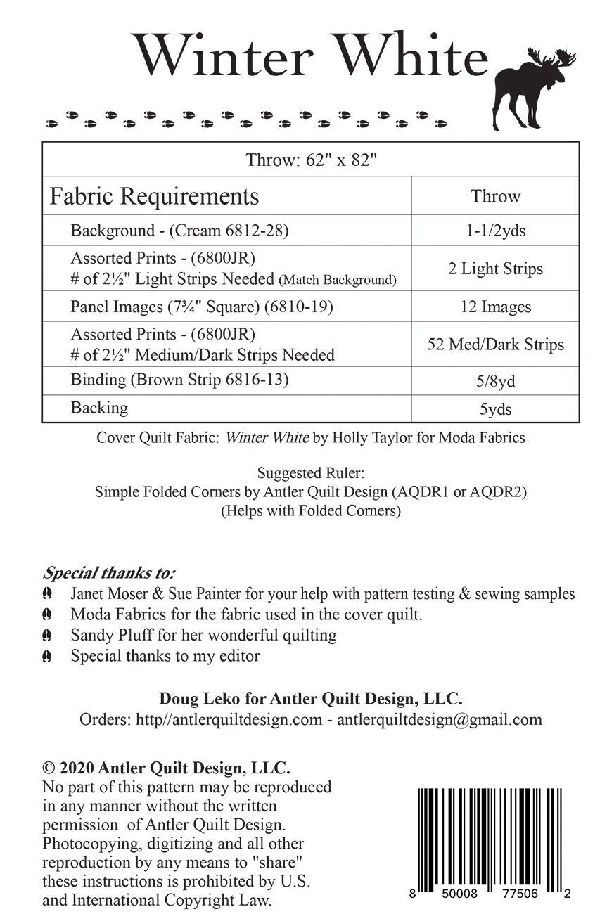 FULL COLOR instructions. Great for scraps! Panel Image and Feature Fabric Friendly! Sizes: Throw: 62" x 82" Fabrics used in the pattern cover quilt Winter White by Holly Taylor for Moda Fabrics Recommend notion: Simple Folded Corners or Mini Simple Folded Corners ruler
