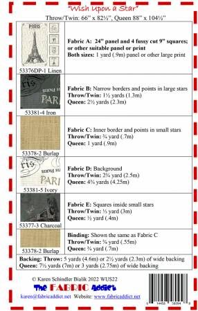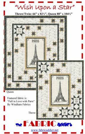 From Fabric Addict By Schindler, Karen In Quilts Wish Upon a Star quilt pattern. Queen and Throw/Twin sizes. Easy quilt using a panel. Suggested ruler is Wing Clipper. Printed Paper Pattern Finished Size: Throw/Twin 66in x 82-1/2in & Queen 88in x 104-1/2in Final Product: Quilt Technique Used: Standard Machine Sewing Skill Level: Confident Beginner