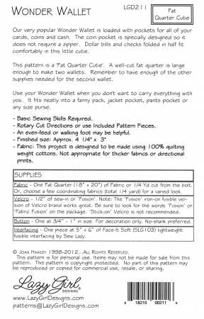 From Lazy Girl Designs - Joan Hawley By Hawley, Joan In Bags, Purses, Totes & Electronic Covers You’ll be surprised at how much this fabric wallet can hold. It’s loaded with pockets for all of your cards, coins and cash. Dollar bills folded in half fit comfortably. Use your Wonder Wallet when you don’t want to carry everything with you. Finished size approx: 4 1/4? X 3? (wallet closed)