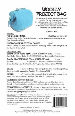 Pattern includes 2 handbag stays. Bag is 9” wide x 7” deep x 6” tall Cross hatch quilted wool bag; uses one hand dyed wool fat quarter Palm sized bag. Great for small hand sewing projects Also uses: Bosal’s IN-R-FORM Plus a double-sided fusible foam batting (Item #493-18) Bosal’s pre-cut Mini Poppins Bag Bottoms (Item #437F-9) or CrafTex Plus (337F) by the bolt Aunties Two 24” Handbag Zipper with Double Slides in 19 colors ATZ24