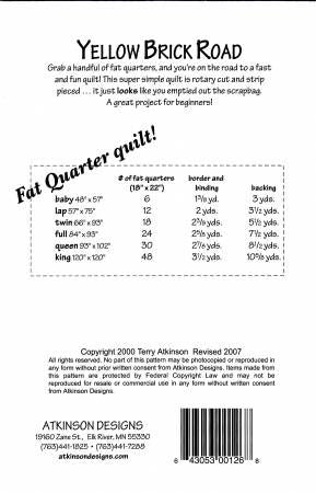 Yellow Brick Road Quilt Pattern is a fast and fun design that is perfect for beginners. Grab a few fat quarters in your favorite colorways to personalize this lively project and you'll be well on your way to where the magic happens. Finished sizes: Baby - 48in x 57in Lap - 57in x 75in Twin - 66in x 93in Full - 84in x 93in Queen - 93in x 102in King - 120in x 120in Printed Paper Pattern Final Product: Quilt Finished Size: 48in x 57in, 57in x 75in, 66in x 93in, 84in x 93in, 93in x 102in, and 120in x 120in Technique: Standard Machine Sewing Skill Level: Beginner