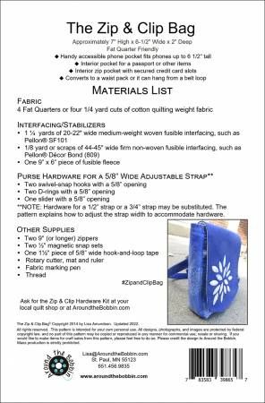 From Around the Bobbin By Amundson, Lisa In Bags, Purses, Totes & Electronic Covers The Zip and Clip Bag is the little bag with big bag organization! Special features include front phone pocket, front zip pocket, interior credit card slots secured inside zip pocket, and interior pocket for passport or other items. Safe and secure for travel or hands-free outings around town, the Zip and Clip Bag can be worn as a cross-body bag or converted to a waist bag. Fat quarter friendly! Updated with improved easier-to-follow instructions and labeling of pieces. Printed Paper Pattern Finished Size: 7in x 6-1/2in x 2in Final Product: Bag/Tote/Purse Technique Used: Standard Machine Sewing Skill Level: Intermediate