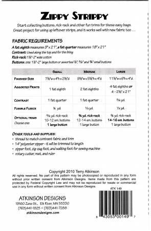 From Atkinson Designs By Atkinson, Terry In Bags, Purses, Totes & Electronic Covers Start collecting buttons, rick-rack, and other fun trims for these easy quilt-as-you-go bags. Great project for using leftover strips, and it works well with new fabric too! small 7-1/2" x 4, medium 9-1/2" x 5-1/2", large 11-1/2 x 6"